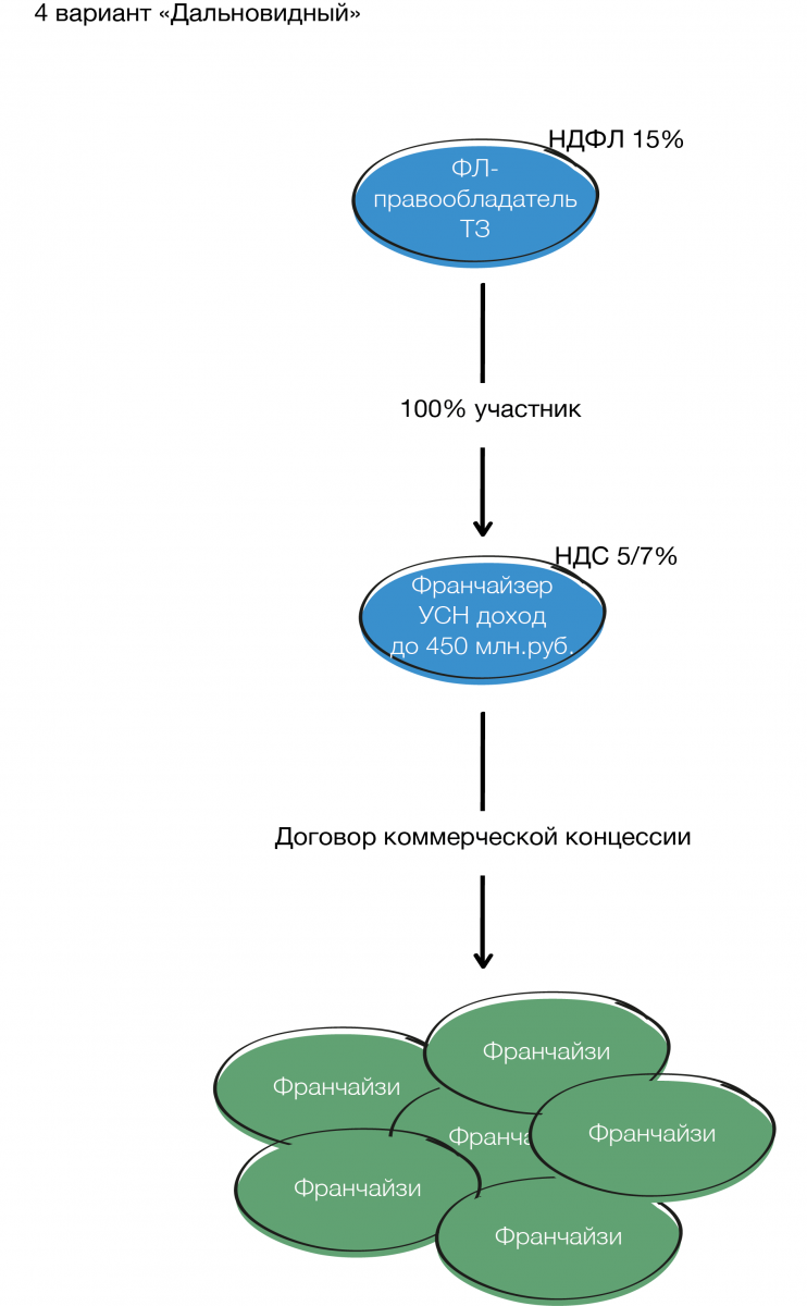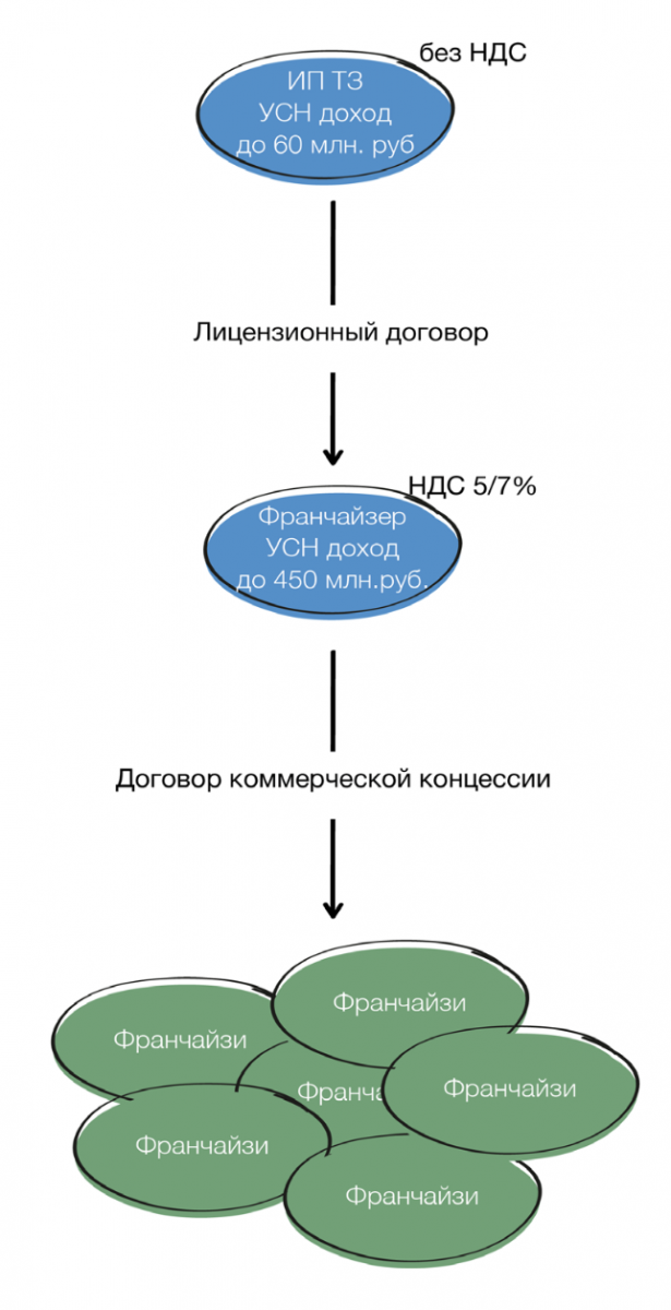 Держатель ТЗ укладывается в 60 млн, но сеть франчайзи разрослась, так что на Франчайзере аккумулируется до 250/450 млн, соответственно, возникает оборотный НДС в размере 5-7% соответственно его доходу